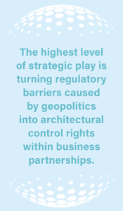 The highest level of strategic play is turning regulatory barriers caused by geopolitics into architectural control rights within business partnerships. European companies have a key advantage: their strong grasp of the EU’s intricate regulatory frameworks enables them to help partners’ products comply and access the European market.
